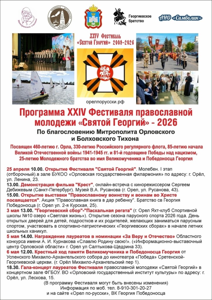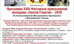 С 25 апреля по 6 мая в Орловской епархии пройдет традиционный фестиаль православной молодежи «Святой Георгий». По благословению Митрополита Орловского и Болховского Тихона, XXIV Фестиваль православной молодежи «Святой Георгий-2026», посвящен 460-летию города Орла, 330-летию Российского регулярного флота, 85-летию начала Великой Отечественной войны 1941-1945 гг.и 81-й годовщине Победы над нацизмом, а …