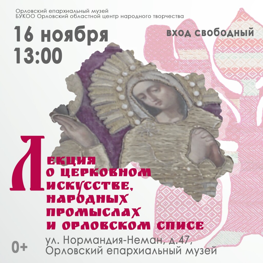 16 ноября 2025 года, в воскресенье в Орловском епархиальном музее на втором этаже нового здания епархиального управления по адресу: город Орел, улица Нормандия-Неман, 47 состоится лекция о предметах церковного обихода, богатым собранием которых обладает музей, а также рассказ о народных традициях, промыслах и крестьянском быте Орловщины и мастер-класс, посвященный традиционной вышивке Орловский спис. О церковном искусстве и предметах церковного обихода расскажет заведующий музеем Комраков Роман Викторович, а о народных традициях и промыслах, расскажет и проведет и мастер-класс народный мастер Орловской области Черина Марина Ивановна.