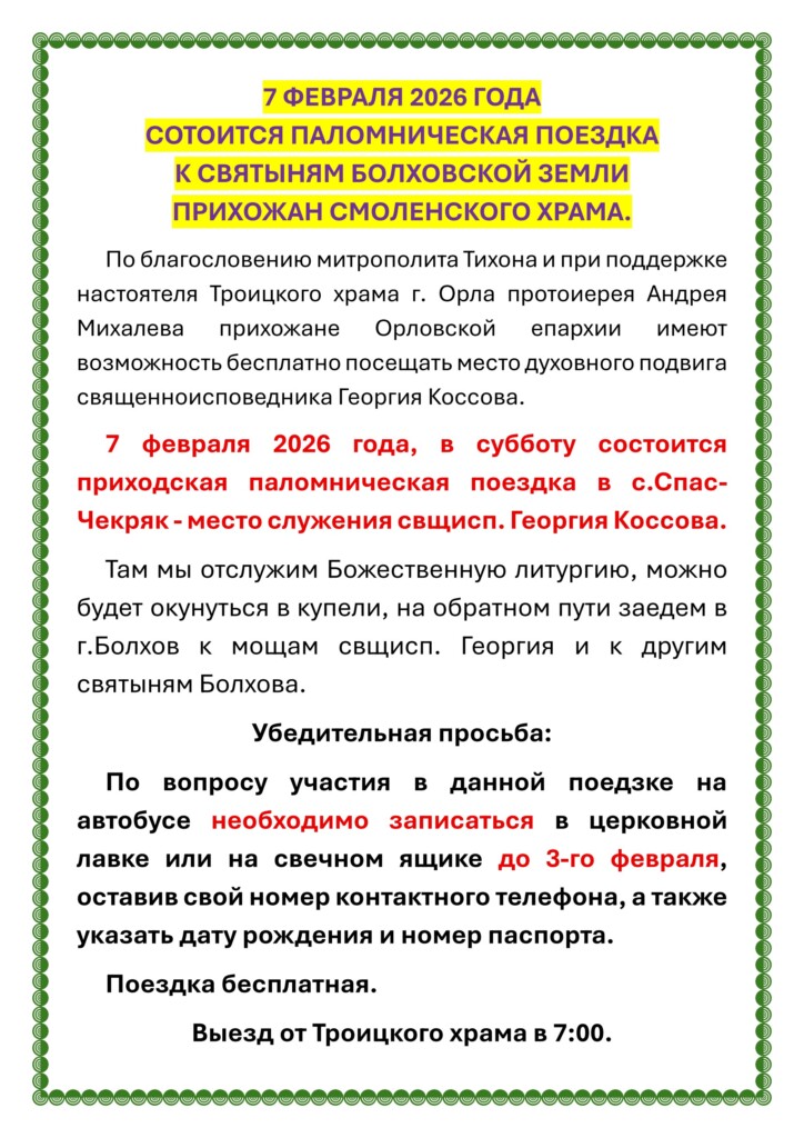 Уважаемые прихожане, 7 февраля состоится Паломническая поездка в Спас-Чекряк на место служения священноисповедника Георгия Коссова