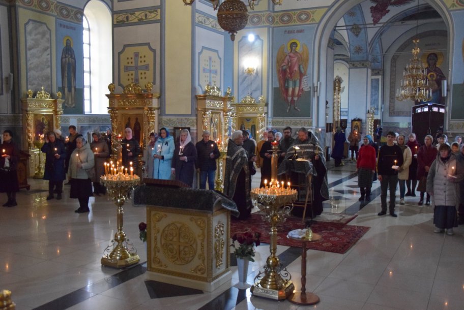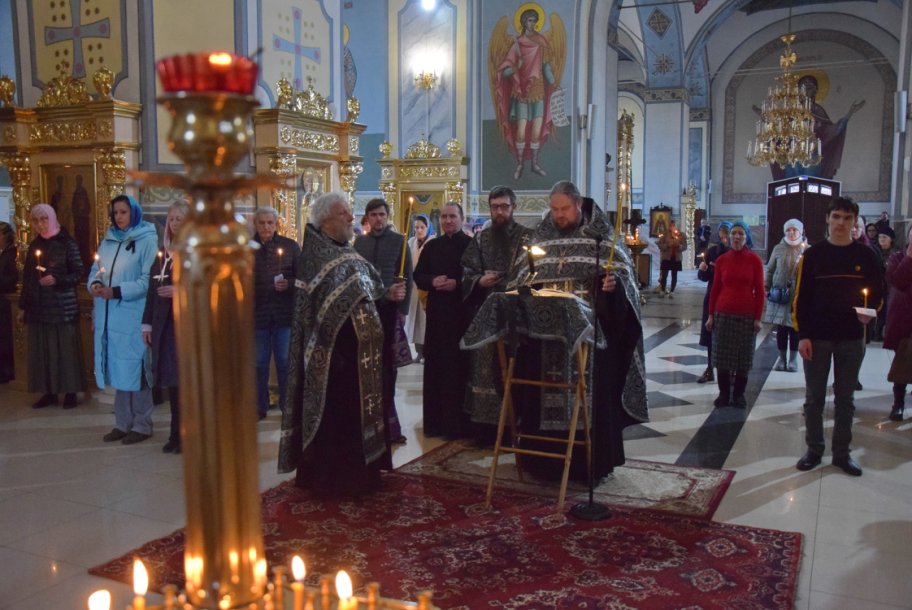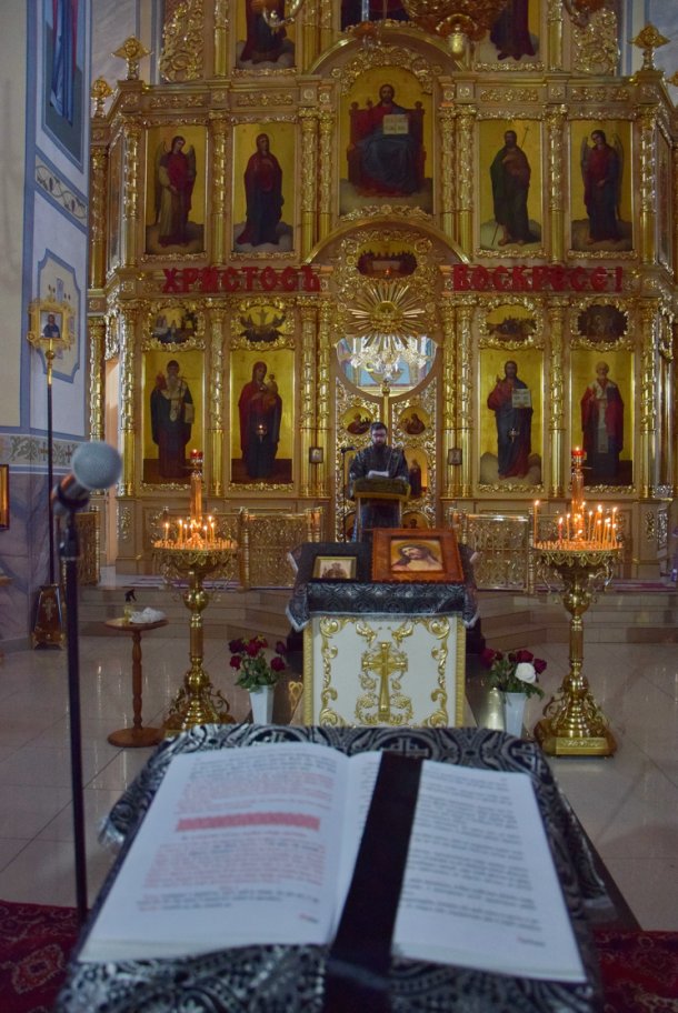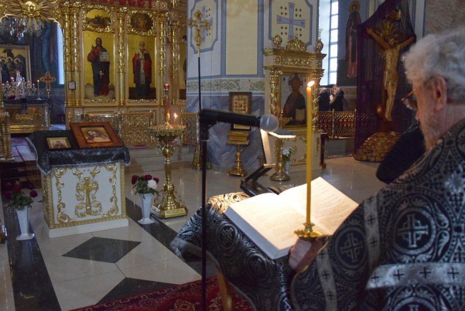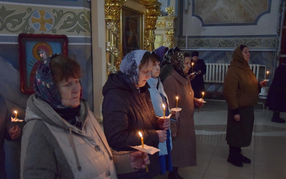 В среду вечером в храме — особая атмосфера. Верующие стоят с зажженными свечами. В центре храма — аналой с иконой Марии Египетской.